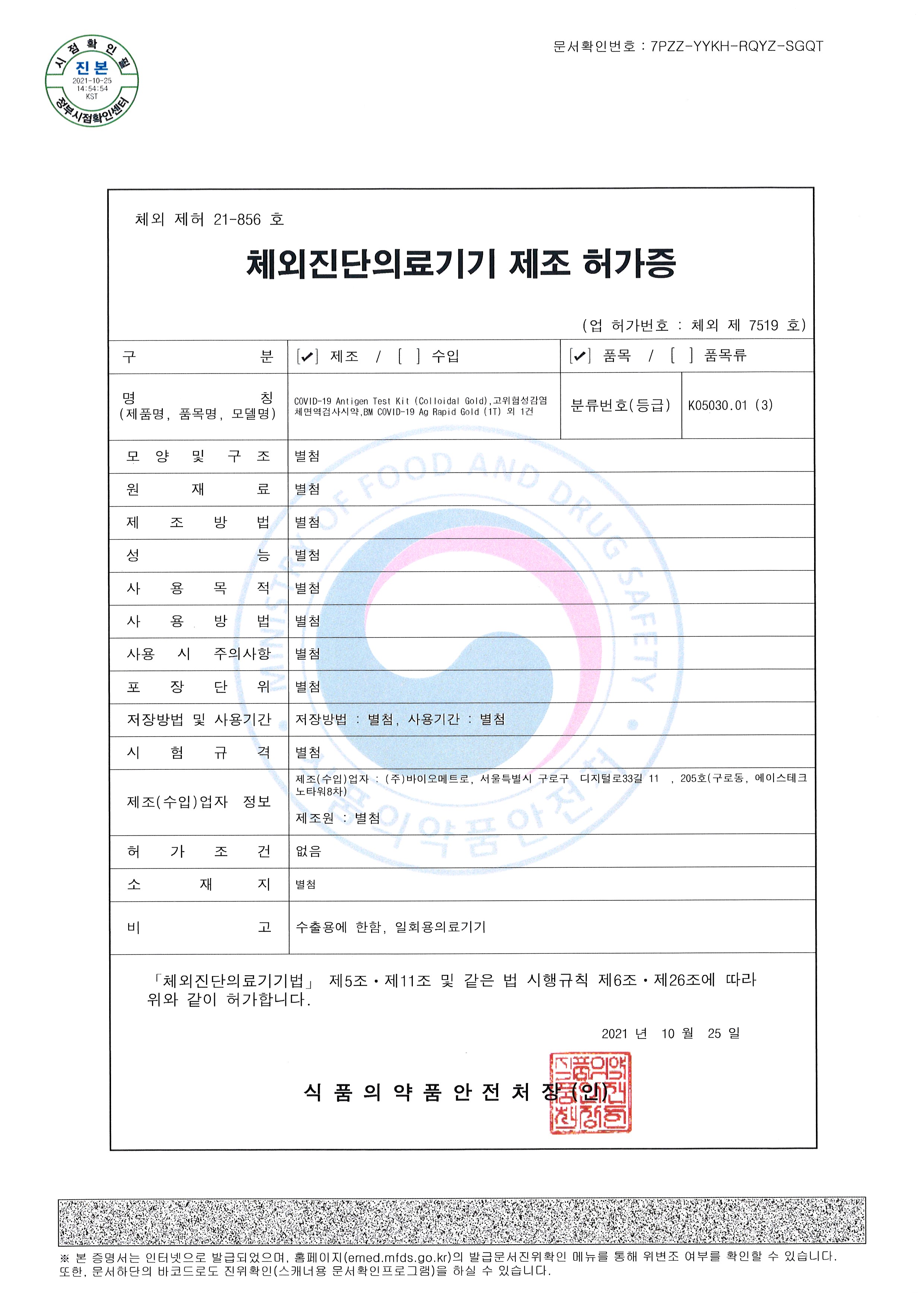 바이오메트로 “체외진단의료기기(COVID-19 Ag Rapid Gold) 수출 제조 허가증”취득
